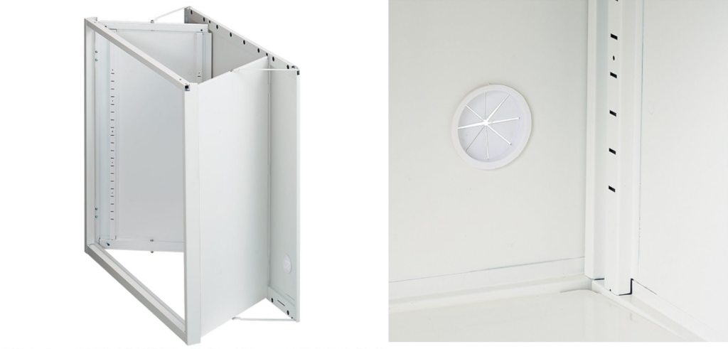 A cable access hole at the bottom allows power cords to pass through from the back, enabling use with electrical equipment or displays. When not in use, the cabinet folds flat for compact storage.